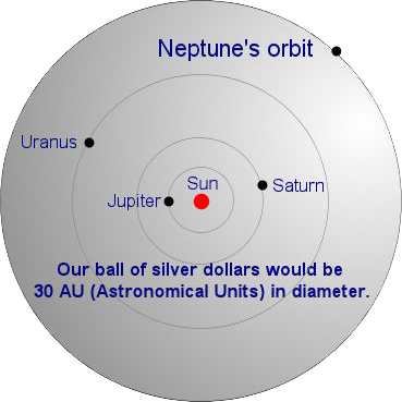 Using the same type of illustration as the coins covering Texas, if we were to press this many (1045) silver dollars into a ball and place the center of this ball where the center of our Sun is, this silver ball's outer edge would be in approximately the same area as the orbit of Neptune (almost to Pluto.).