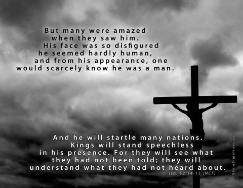 "He was despised and rejected by mankind, a man of suffering, and familiar with pain. Like one from whom people hide their faces, He was despised, and we held Him in low esteem. Surely He took up our pain and bore our suffering, yet we considered Him punished by God, stricken by Him, and afflicted. But He was pierced for our transgressions, He was crushed for our iniquities; the punishment that brought us peace was on Him, and by His wounds, we are healed."